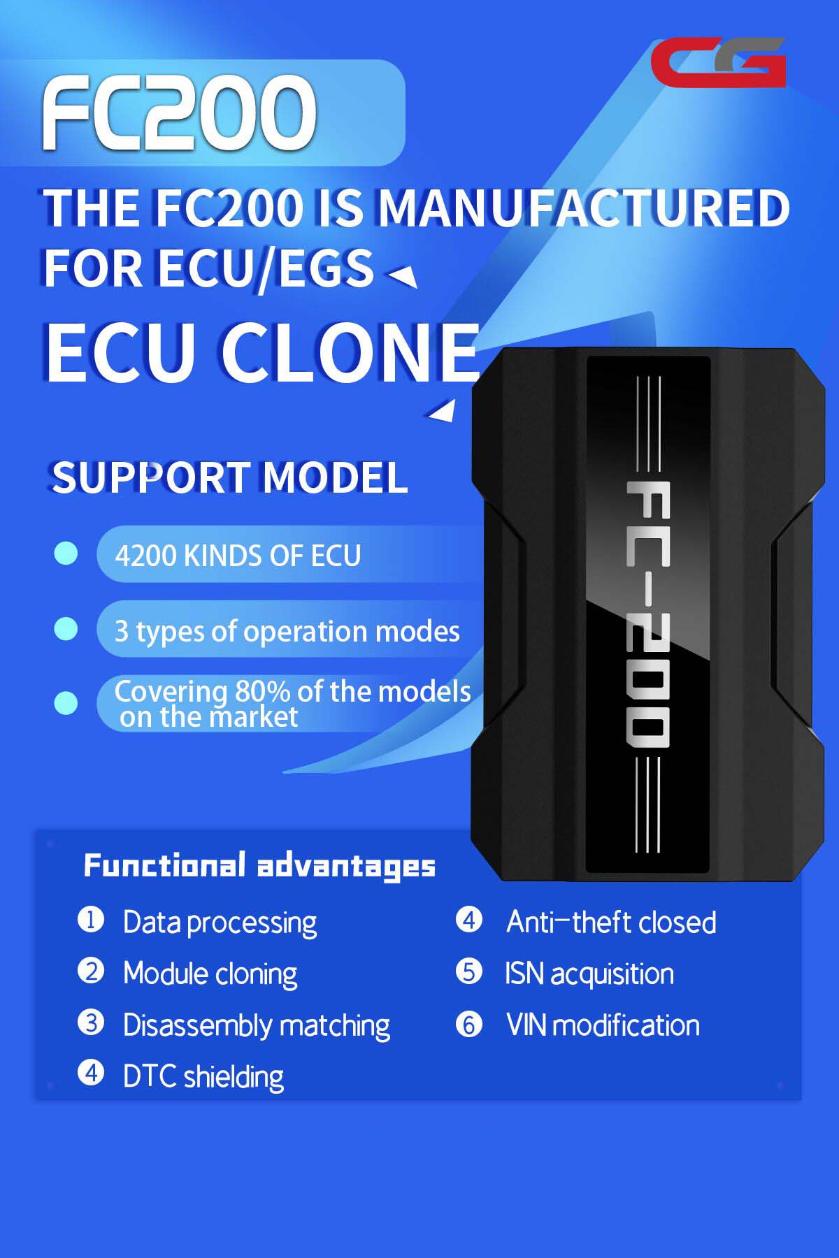 FC200 ecu programmer is new device which is designed for ECU/EGS clone, supports functions including data reading and writing, ISN acquisition, disassembly matching, module clone, VIN modification and DTC shielding ect.