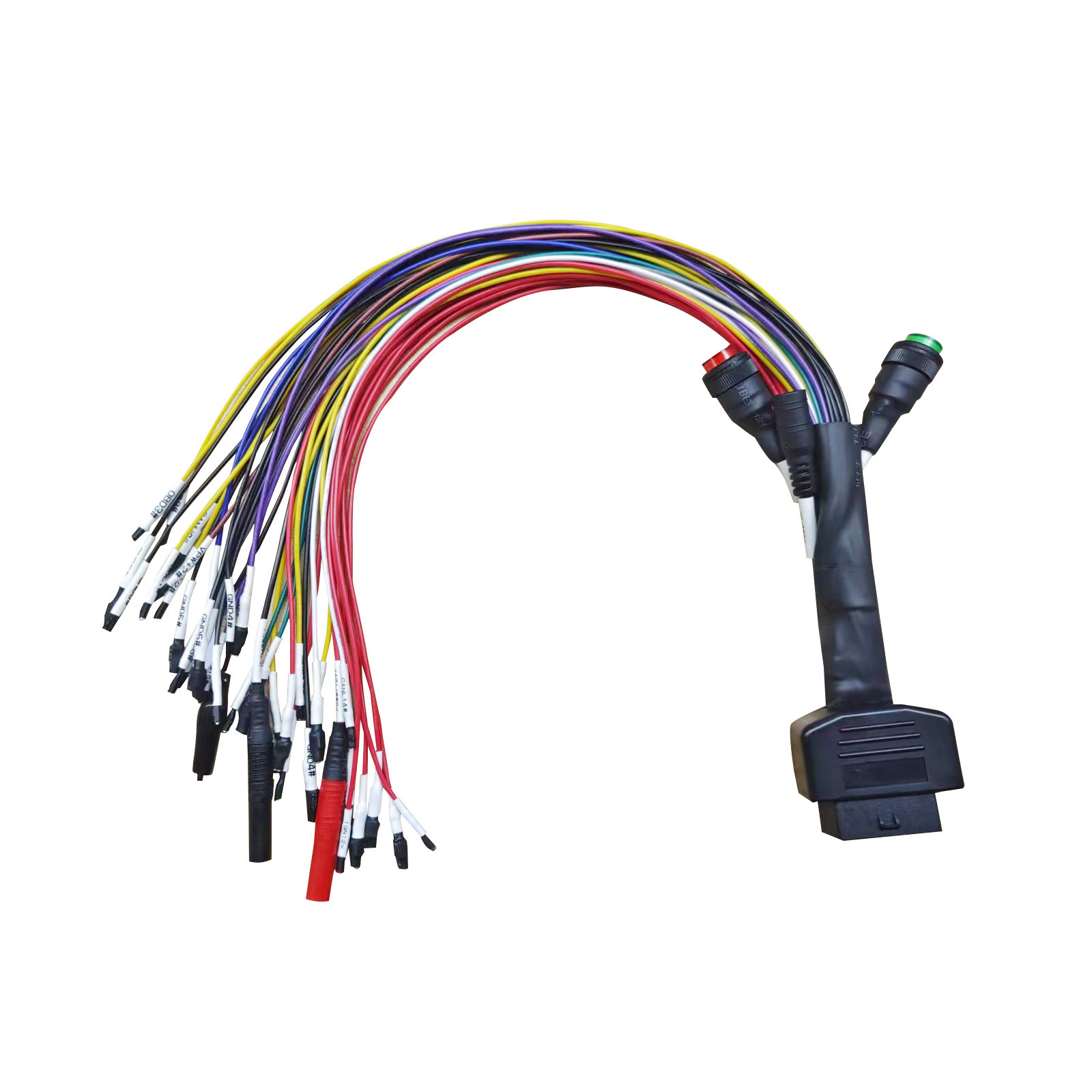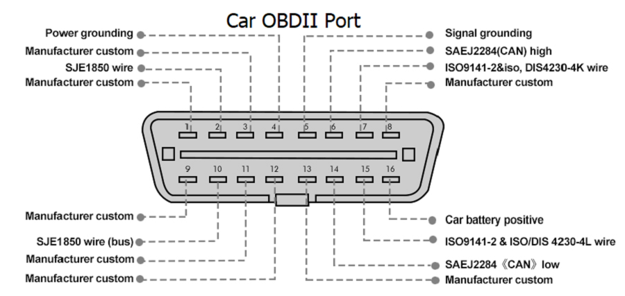 9. Manufactory custom 10. SJE1850 wire (bus) 11. Manufactory custom 12. Manufactory custom 13. Manufactory custom 14. SAEJ2284《CAN》low 15. ISO9141-2 & ISO/DIS 4230-4L wire 16. Car battery positive |