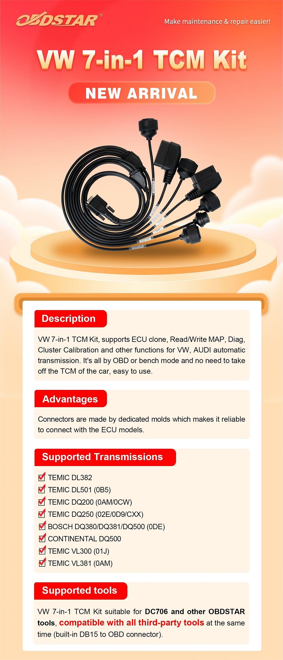 OBDSTAR VW 7-in-1 TCM Kit, supports ECU clone, Read/Write MAP, Diag, Cluster Calibration and other functions for VW, AUDI automatic transmission. It's all by OBD or bench mode and no need to take off the TCM of the car, easy to use.