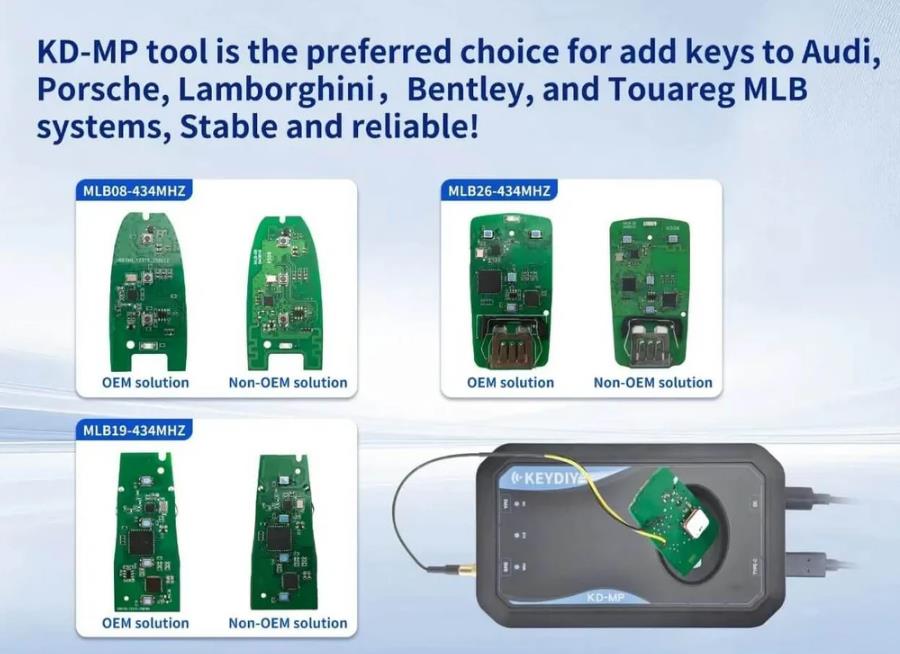 The KD-MP is a professional locksmith tool designed for MLB and MQB IMMO systems. By connecting to the PC software, it supports the following functions without chip removal: - MLB/MQB key identification, data collection, and calculation - Dealer key generation - KD key functions: Modify ID, adjust key values, change sensitivity, restore keys - Online firmware upgrades - Expandable functionality (additional features to be released)